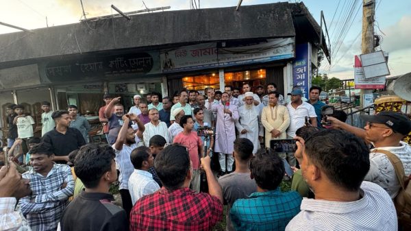 দক্ষিণ সুরমার কামাল বাজারে ৩১ দফার লিফলেট বিতরণ ও ধানের শীষের পক্ষে খান জামালের প্রচারণা।